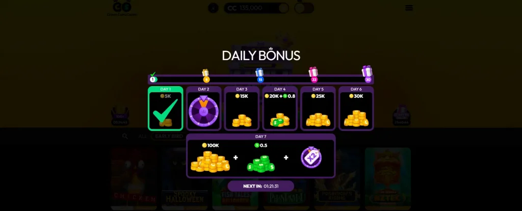 | Daily Crown Coins Casino Login No Deposit Bonus | A reward that increases in value as the number of consecutive days of logins increases. | Day 1: 5,000 CC;Day 2: 10,000 CC + 0.5 SC;Day 3: 10,000 CC;Day 4: 20,000 CC + 0.8 SC;Day 5: 25,000 CC;Day 6: 30,000 CC;Day 7: 100,000 CC + 0.5 SC. | Resets after Day 7. Must log in daily to progress. |