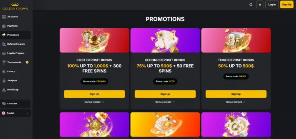 Mid-week spin bonuses help a lot if you plan slot sessions. The tiers are simple: 30 FS at a small deposit, then 60, then 100 at the top step. Once you enter a corresponding Golden Crown bonus code on top-up, free spins will be auto-credited.