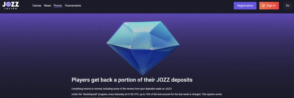 You can think of it as a form of a Jozz casino no deposit bonus. This bonus has absolutely zero wagering restrictions and is paid out in cash to your primary Real Account. You may instantly withdraw it or use it for gameplay. To be eligible for the refund, your total deposits for the week must meet a minimum threshold of $15.