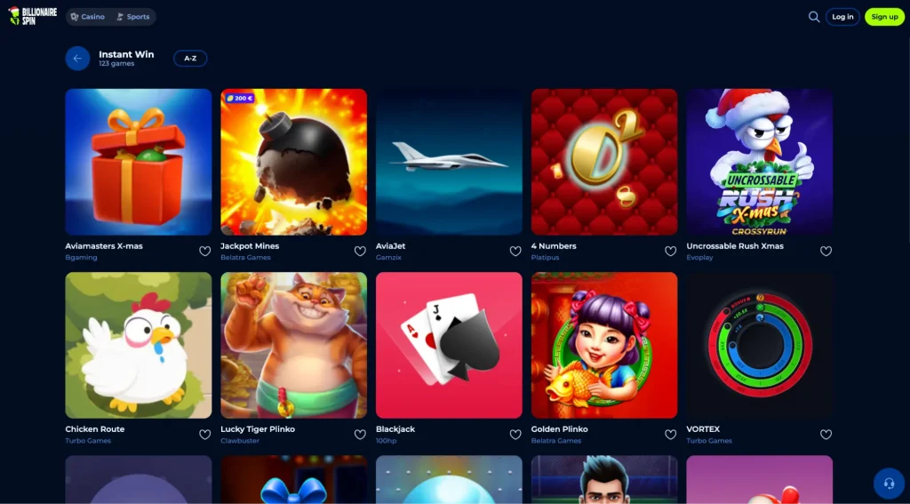 Fans of crash games go to the “Instant Win” area – that’s where the multiplier action lives. The whole section shows 123 titles total, and the crash slice feels big here. It’s mixed with Mines, Plinko, Dice, Limbo, wheels, and some arcade formats.