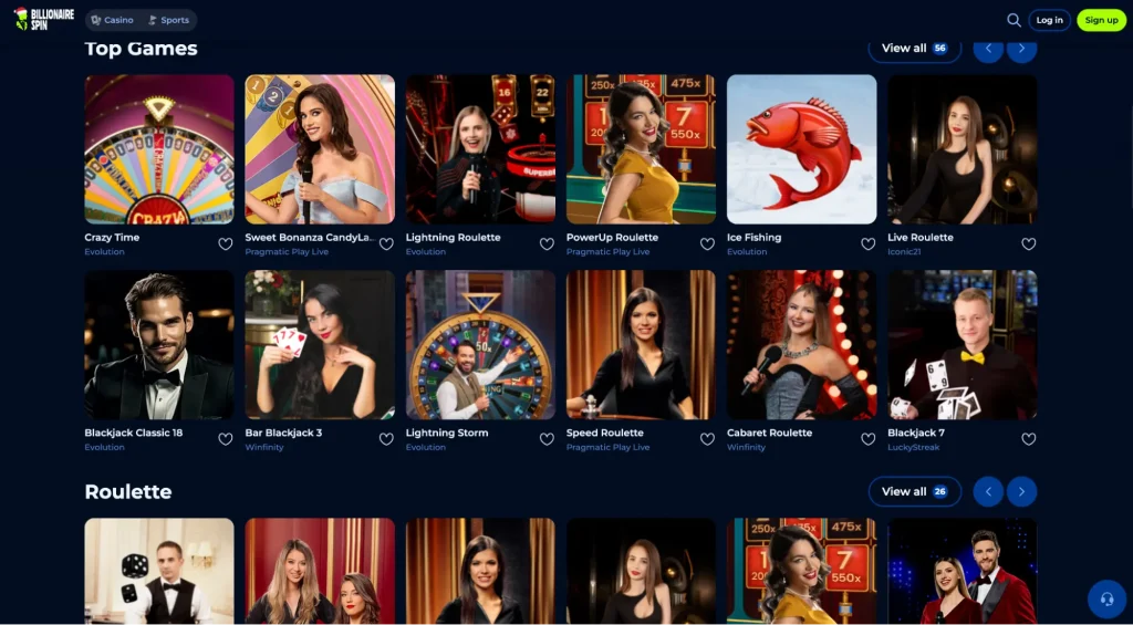 The most popular buckets are classics, but we also saw side-format stuff like one-reel games and bonus-wheel table hybrids. For providers in this area, we noticed a lot coming from Playtech, Platipus, Spinomenal, GameArt, and Mancala Gaming. After your Billionairespin login, this section is worth a scroll if you like variety more than purity.